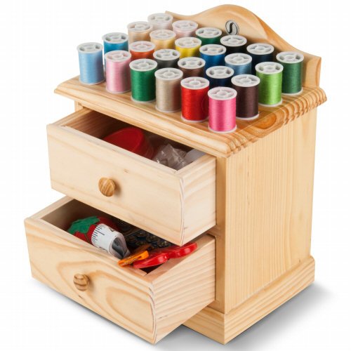 Stock up on all your sewing essentials with the Smartek wooden sewing box. attractive two-drawer wood organizer thread spools are compactly stored on top and easily accessible great gift for sewing novices Set includes: tomato pin cushion, seam ripper, tape measures 5inch scissors, tailor chalk, pleating needle set safety pins, pearl needles, 30-pc needle set, assorted buttons 24 spools of thread (25-yd each), threader, thread wheeler metal thimble, hooks with eyes, snap fasteners Wood. Wipe with damp cloth. Available in colors: Natural Wo. Available from JCPenny.